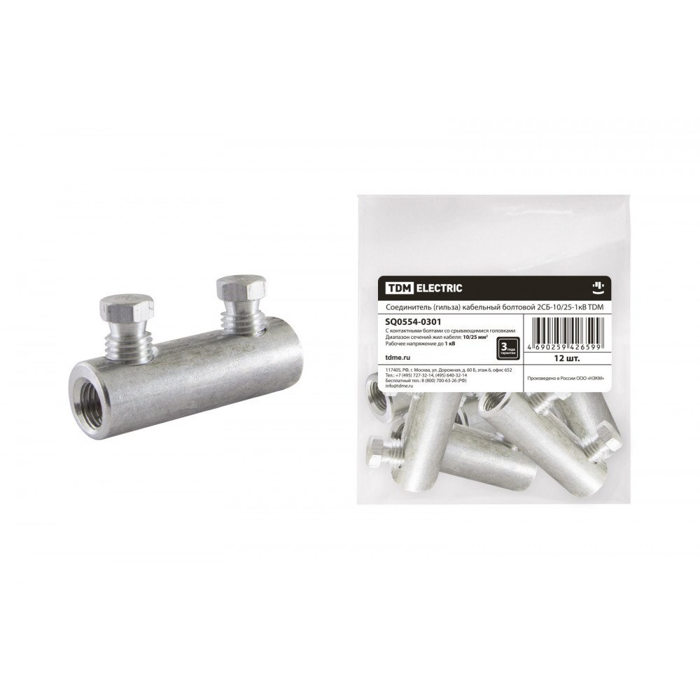 Технические характеристики Соединитель (гильза) кабельный болтовой 2СБ-10/25-1кВ TDM