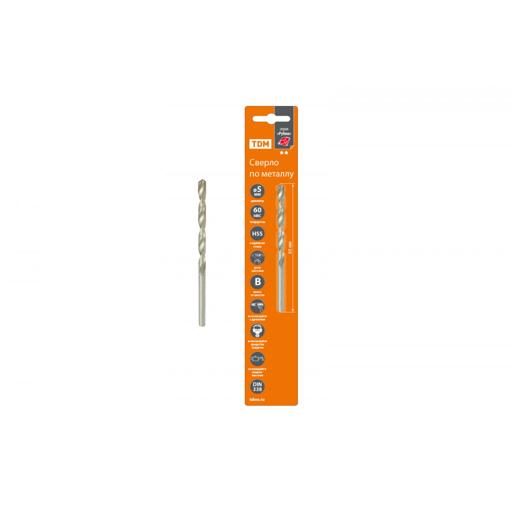 Сверло по металлу, 5 мм, полир., HSS, класс точн. В, 118⁰, цилиндр. хв., блистер 1 шт, "Рубин" TDM
