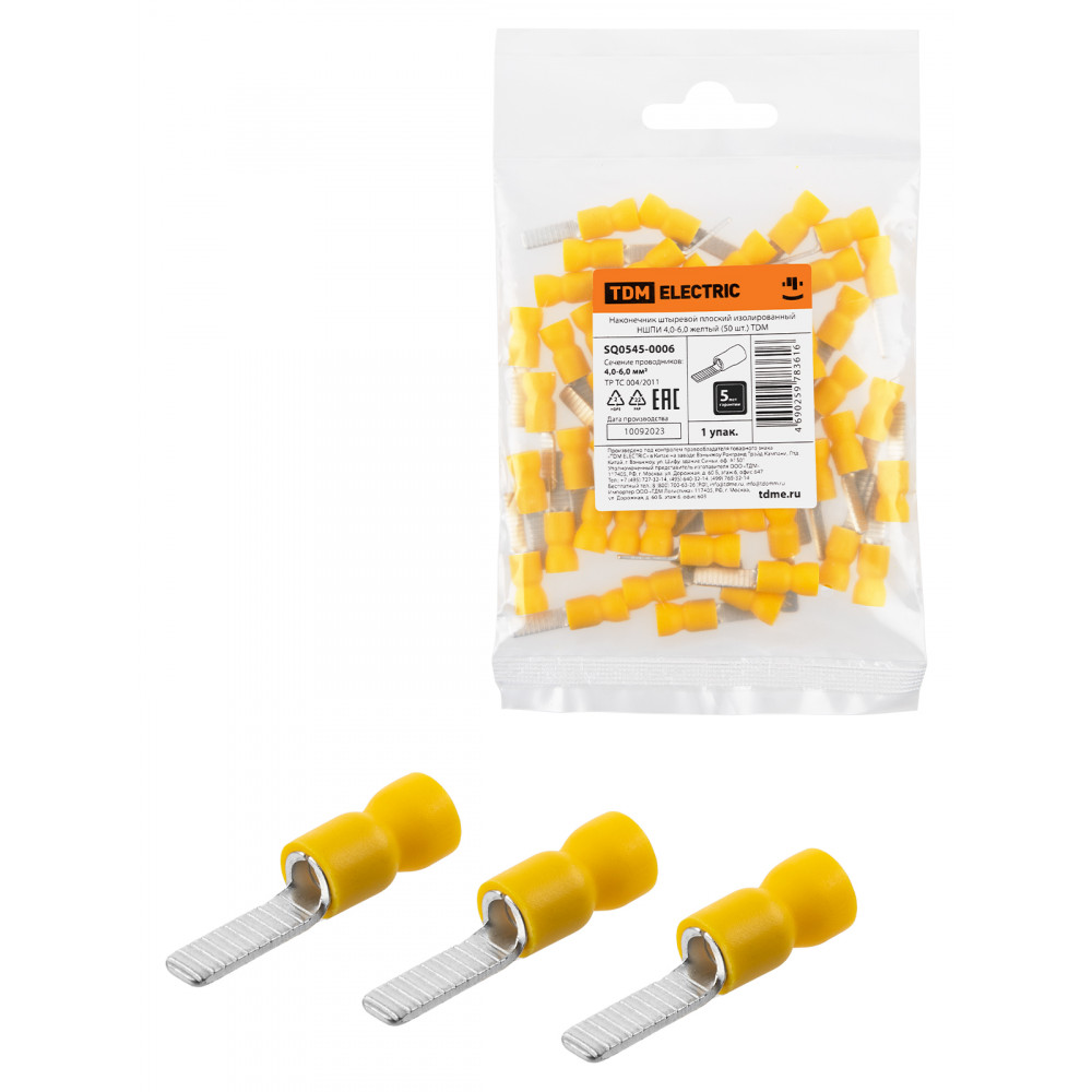 Технические характеристики Наконечник штыревой плоский изолированный НШПИ 4,0-6,0 желтый (50 шт.) TDM