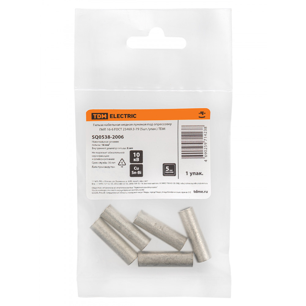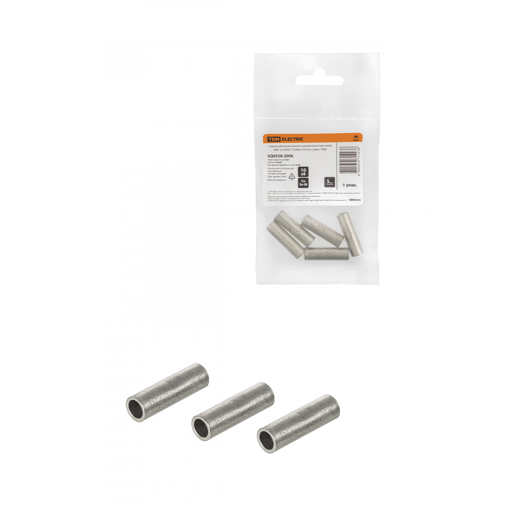 Гильза кабельная медная луженая под опрессовку ГМЛ 16-6 ГОСТ 23469.3-79 (5шт./упак.) TDM
