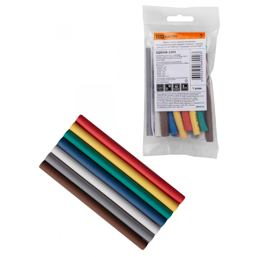 Технические характеристики Набор трубок термоусаживаемых, не поддерживающих горение, клеевых, 7 цветов, длиной 10 см ТТкНГ(3:1) "Полицвет 6,4/2,0 TDM"