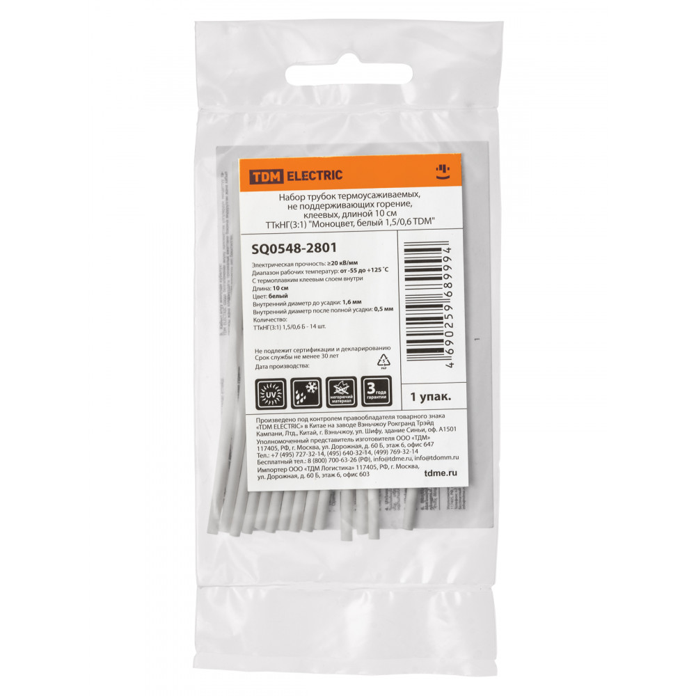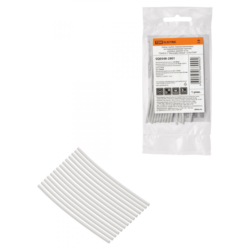 Технические характеристики Набор трубок термоусаживаемых, не поддерживающих горение, клеевых, длиной 10 см ТТкНГ(3:1) "Моноцвет, белый 1,5/0,6 TDM"