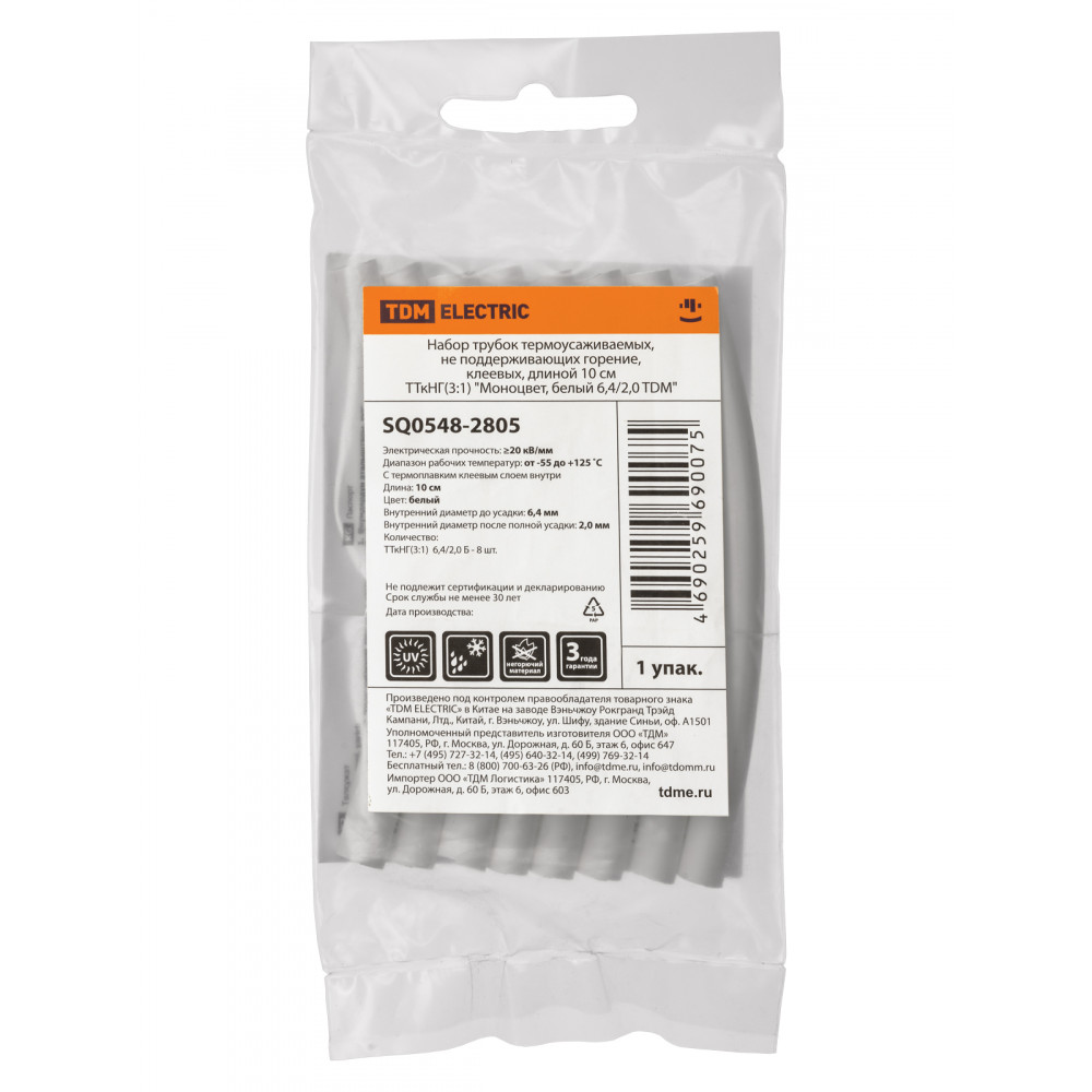Технические характеристики Набор трубок термоусаживаемых, не поддерживающих горение, клеевых, длиной 10 см ТТкНГ(3:1) "Моноцвет, белый 6,4/2,0 TDM"