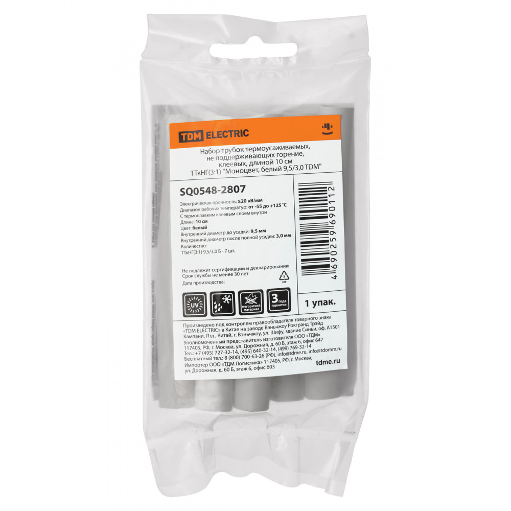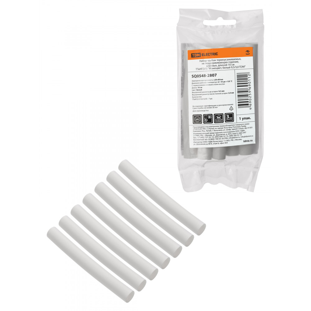 Технические характеристики Набор трубок термоусаживаемых, не поддерживающих горение, клеевых, длиной 10 см ТТкНГ(3:1) "Моноцвет, белый 9,5/3,0 TDM"