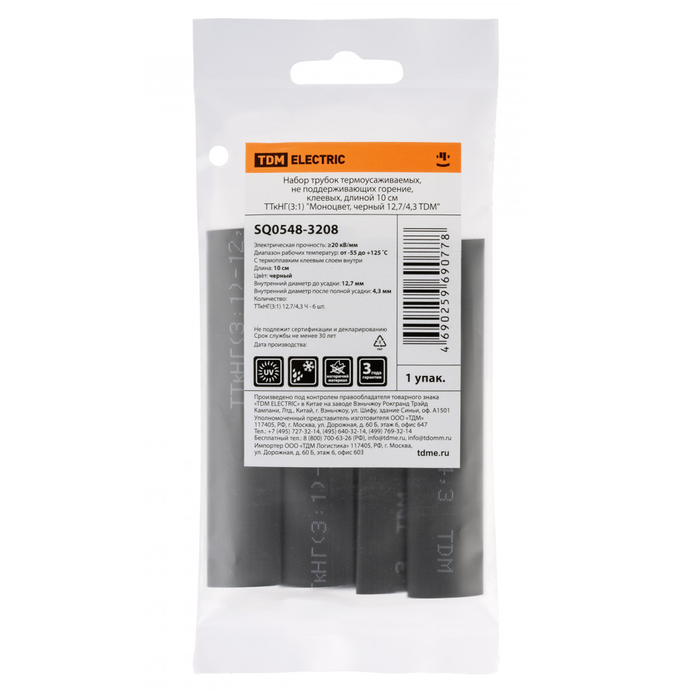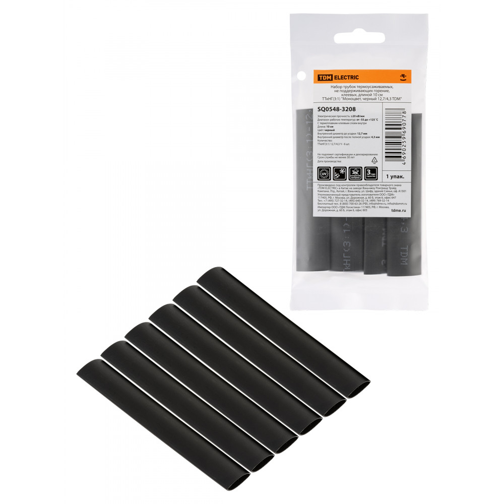 Технические характеристики Набор трубок термоусаживаемых, не поддерживающих горение, клеевых, длиной 10 см ТТкНГ(3:1) "Моноцвет, черный 12,7/4,3 TDM"