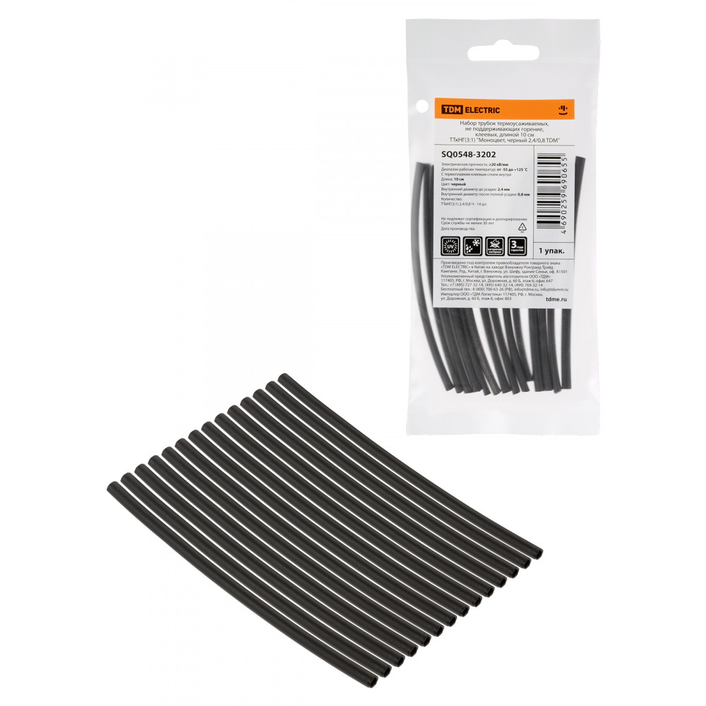 Технические характеристики Набор трубок термоусаживаемых, не поддерживающих горение, клеевых, длиной 10 см ТТкНГ(3:1) "Моноцвет, черный 2,4/0,8 TDM"