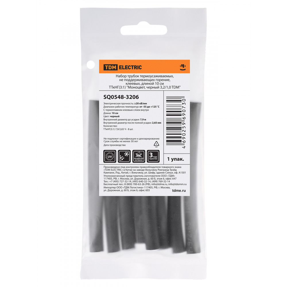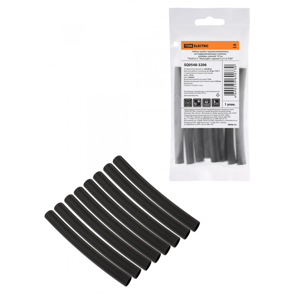 Технические характеристики Набор трубок термоусаживаемых, не поддерживающих горение, клеевых, длиной 10 см ТТкНГ(3:1) "Моноцвет, черный 7,9/2,65TDM"