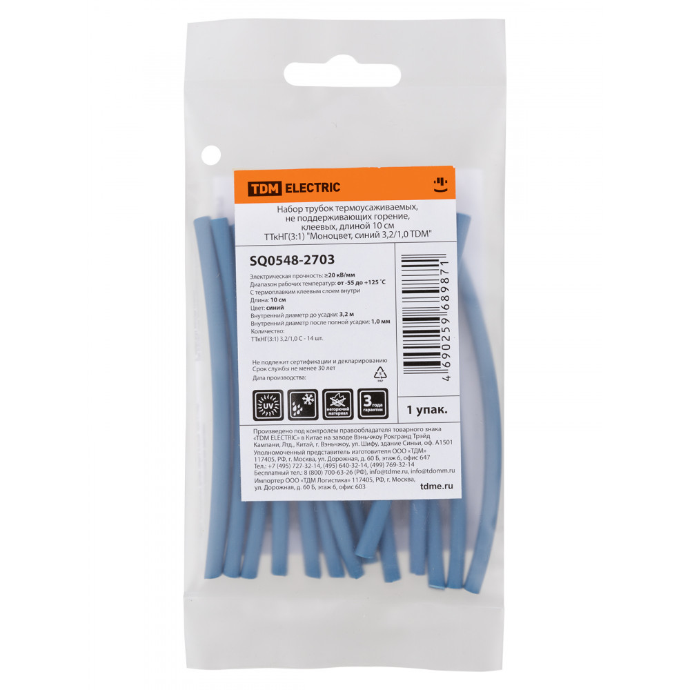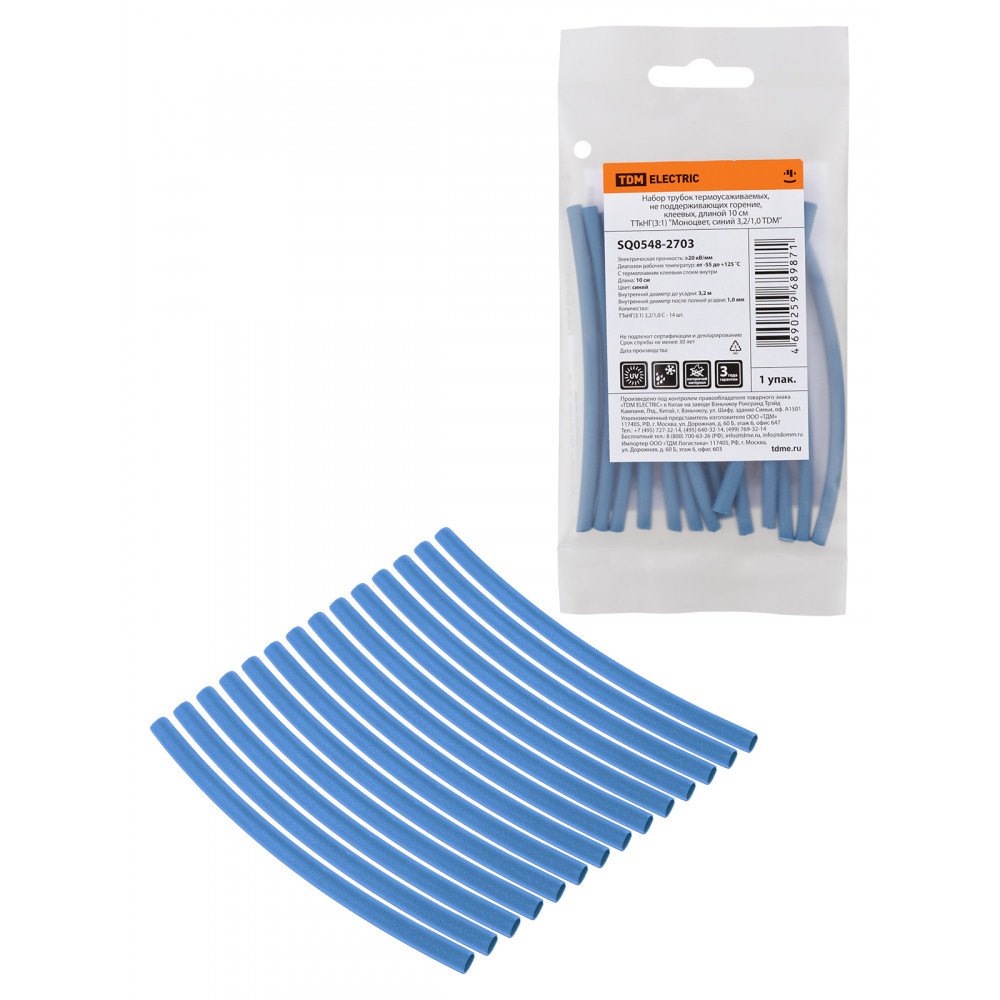 Технические характеристики Набор трубок термоусаживаемых, не поддерживающих горение, клеевых, длиной 10 см ТТкНГ(3:1) "Моноцвет, синий 3,2/1,0 TDM"