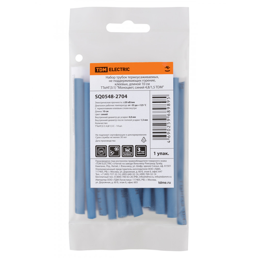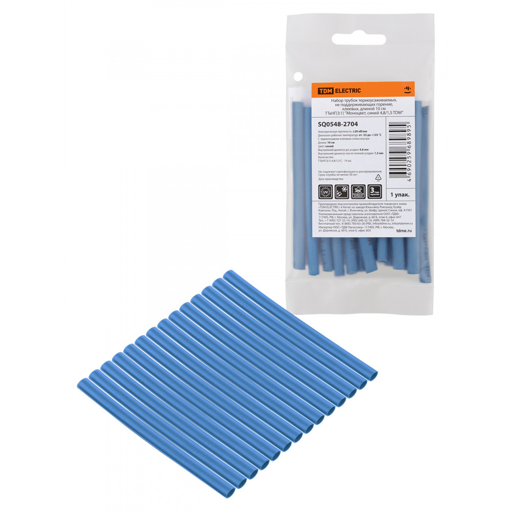Технические характеристики Набор трубок термоусаживаемых, не поддерживающих горение, клеевых, длиной 10 см ТТкНГ(3:1) "Моноцвет, синий 4,8/1,5 TDM"