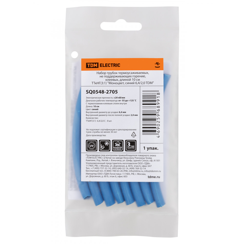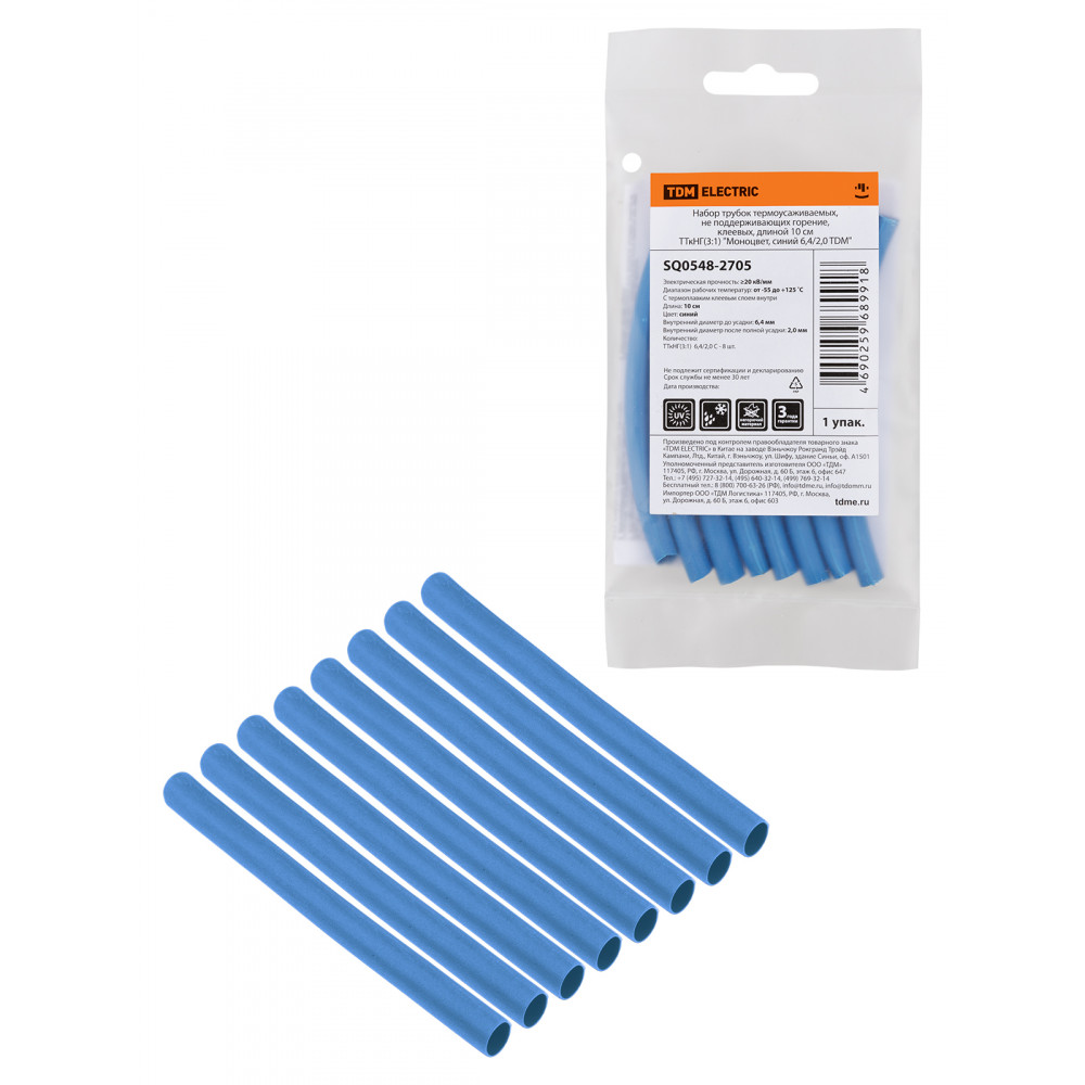 Технические характеристики Набор трубок термоусаживаемых, не поддерживающих горение, клеевых, длиной 10 см ТТкНГ(3:1) "Моноцвет, синий 6,4/2,0 TDM"
