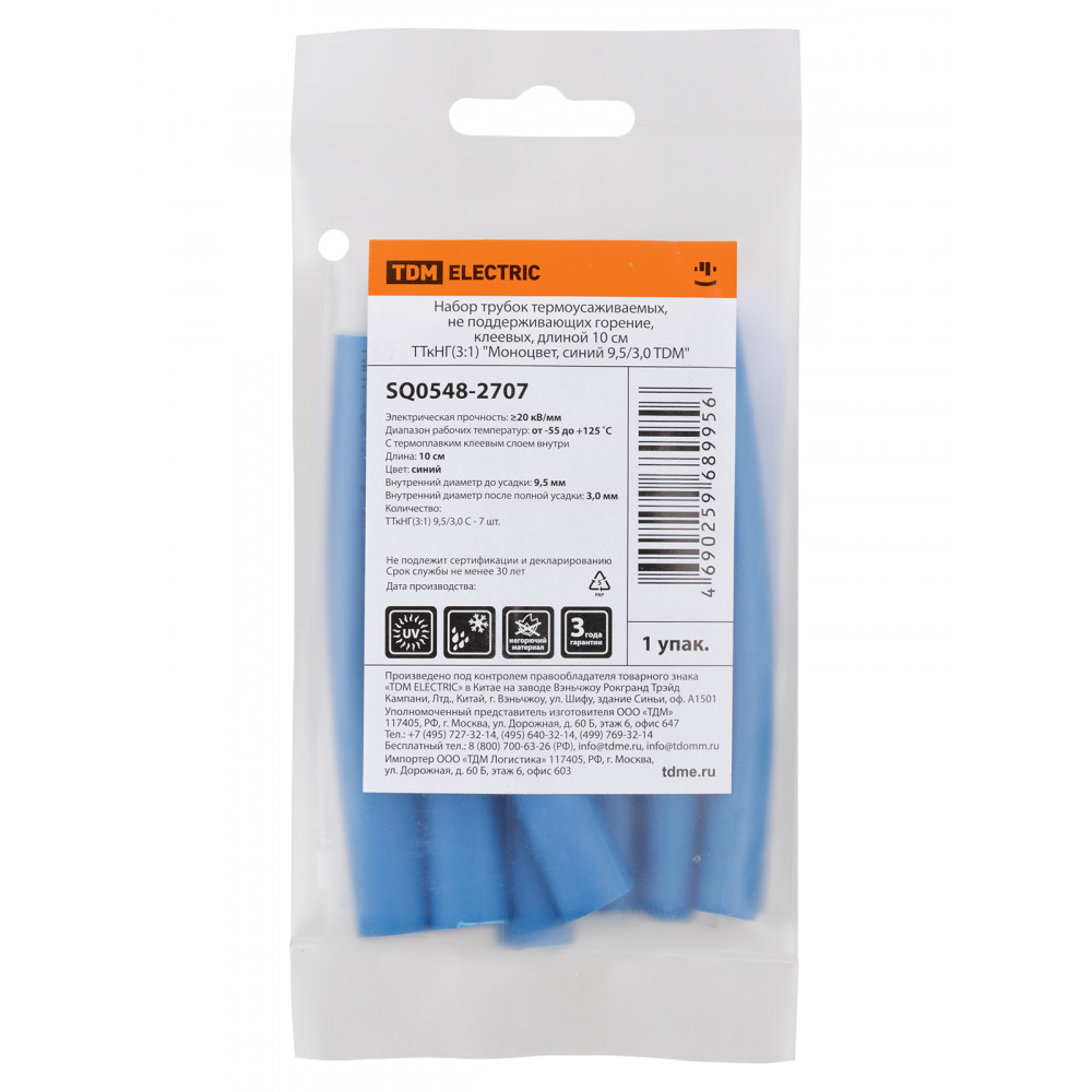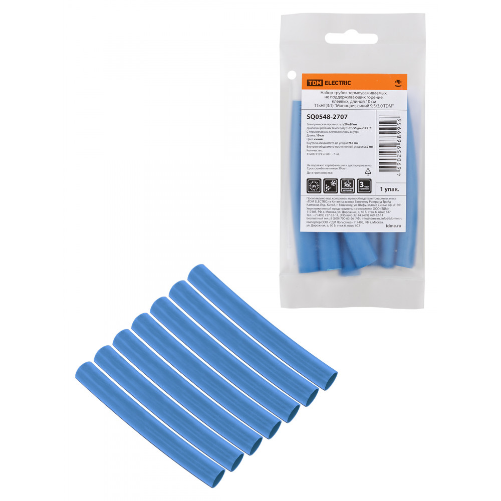Технические характеристики Набор трубок термоусаживаемых, не поддерживающих горение, клеевых, длиной 10 см ТТкНГ(3:1) "Моноцвет, синий 9,5/3,0 TDM"