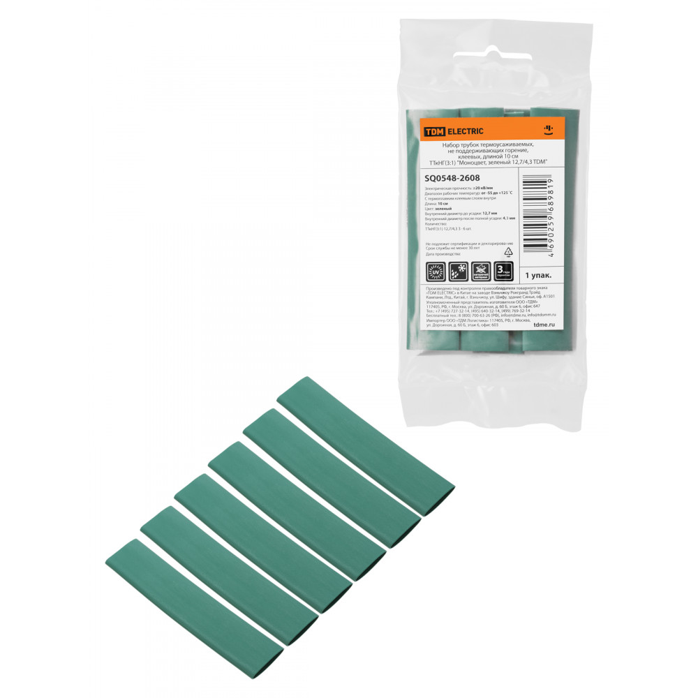 Технические характеристики Набор трубок термоусаживаемых, не поддерживающих горение, клеевых, длиной 10 см ТТкНГ(3:1) "Моноцвет, зеленый 12,7/4,3 TDM"