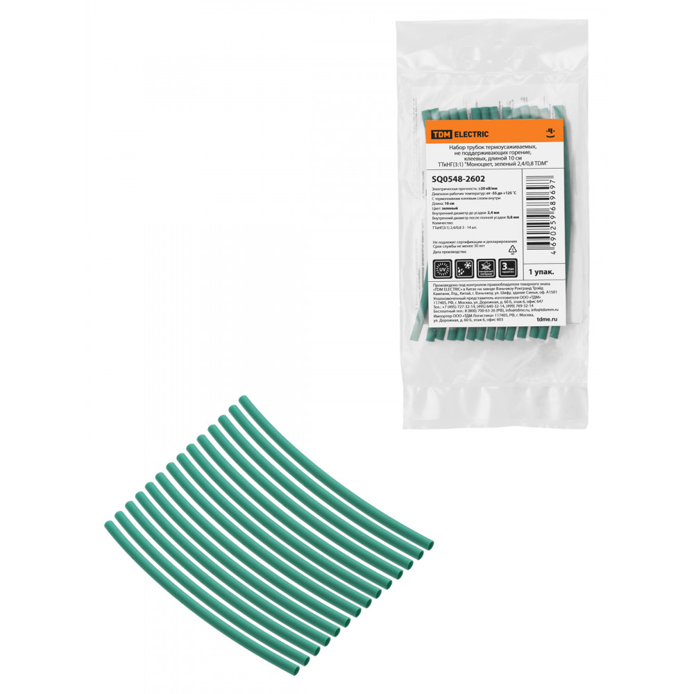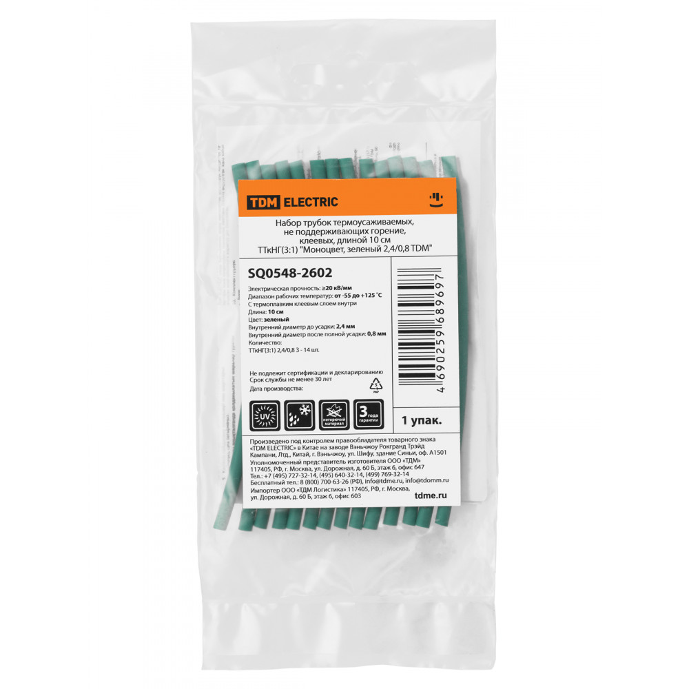 Технические характеристики Набор трубок термоусаживаемых, не поддерживающих горение, клеевых, длиной 10 см ТТкНГ(3:1) "Моноцвет, зеленый 2,4/0,8 TDM"