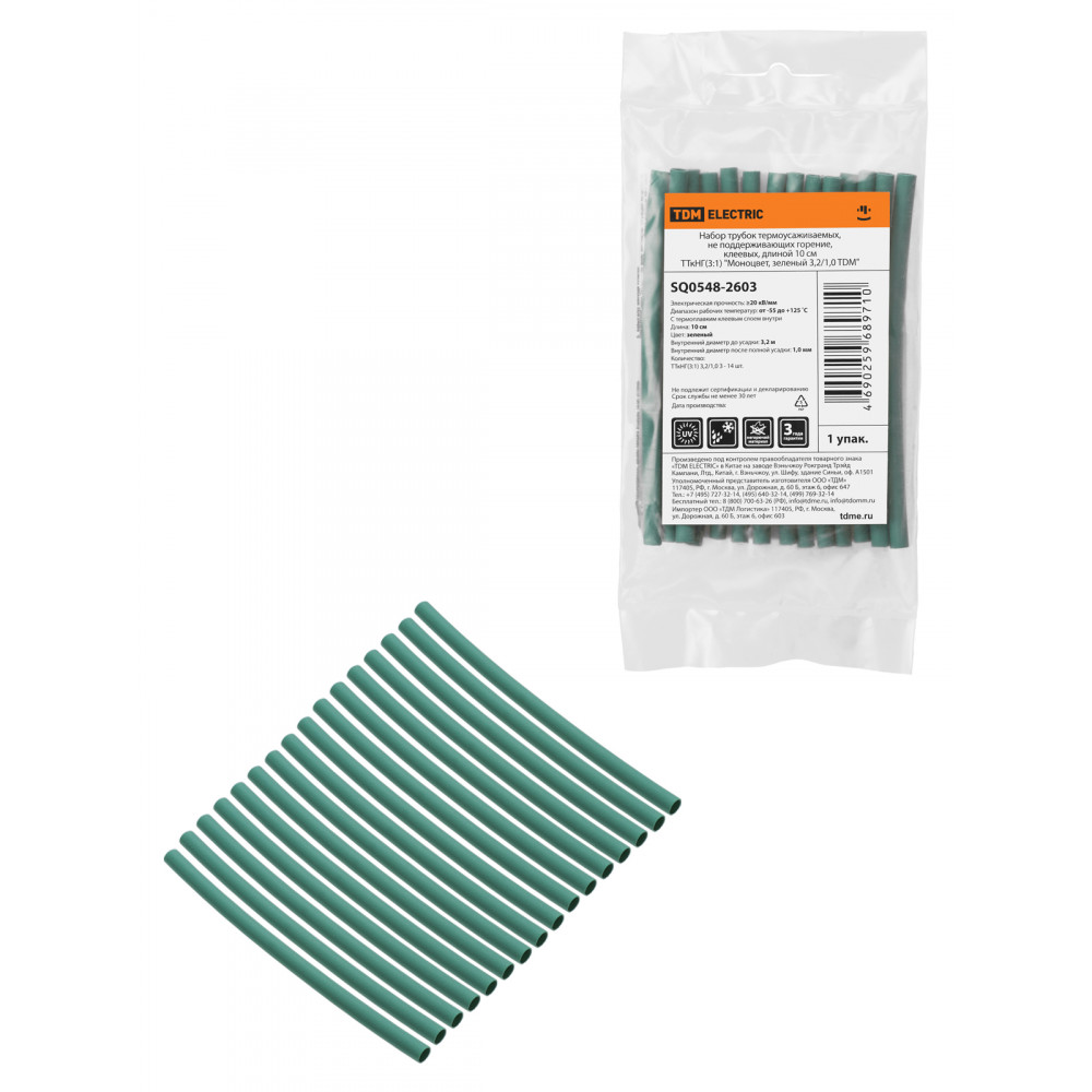 Технические характеристики Набор трубок термоусаживаемых, не поддерживающих горение, клеевых, длиной 10 см ТТкНГ(3:1) "Моноцвет, зеленый 3,2/1,0 TDM"