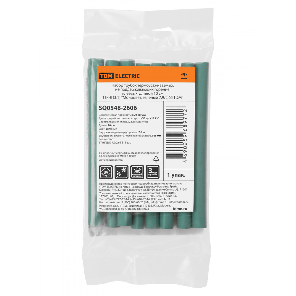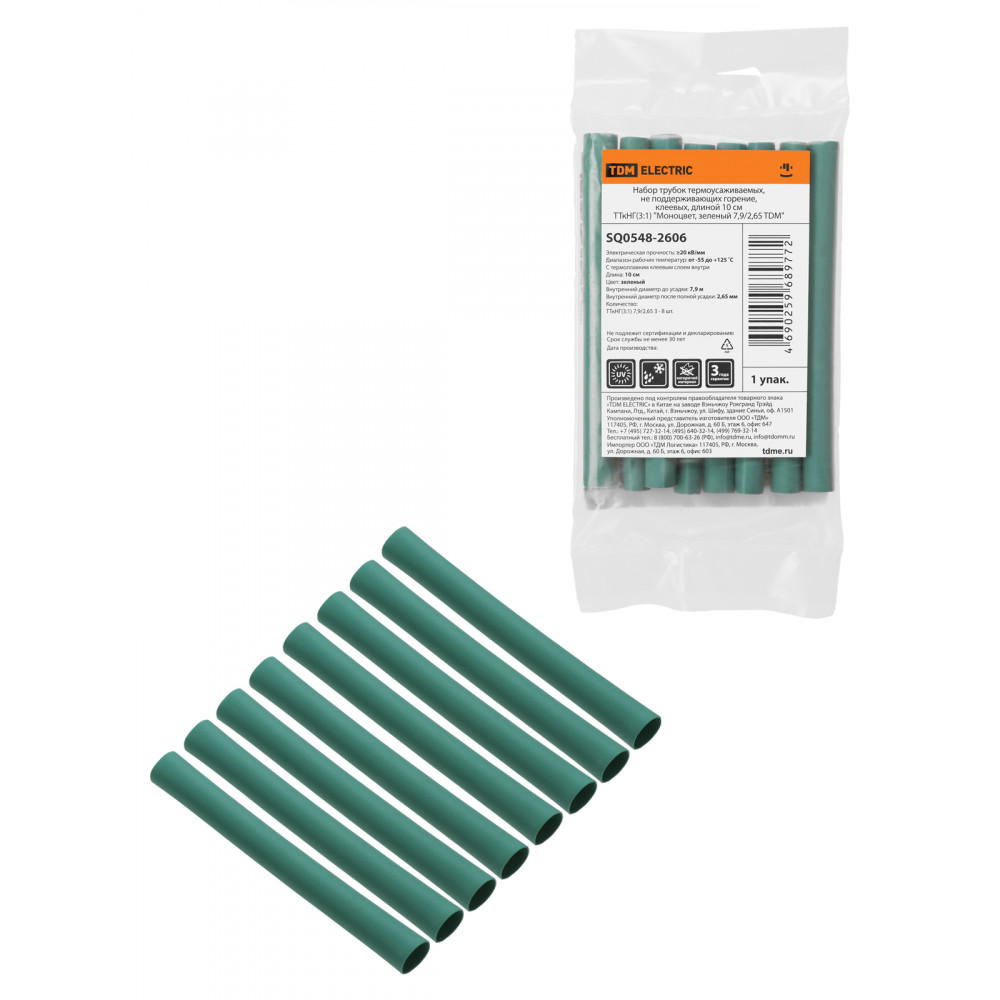 Технические характеристики Набор трубок термоусаживаемых, не поддерживающих горение, клеевых, длиной 10 см ТТкНГ(3:1) "Моноцвет, зеленый 7,9/2,65 TDM"