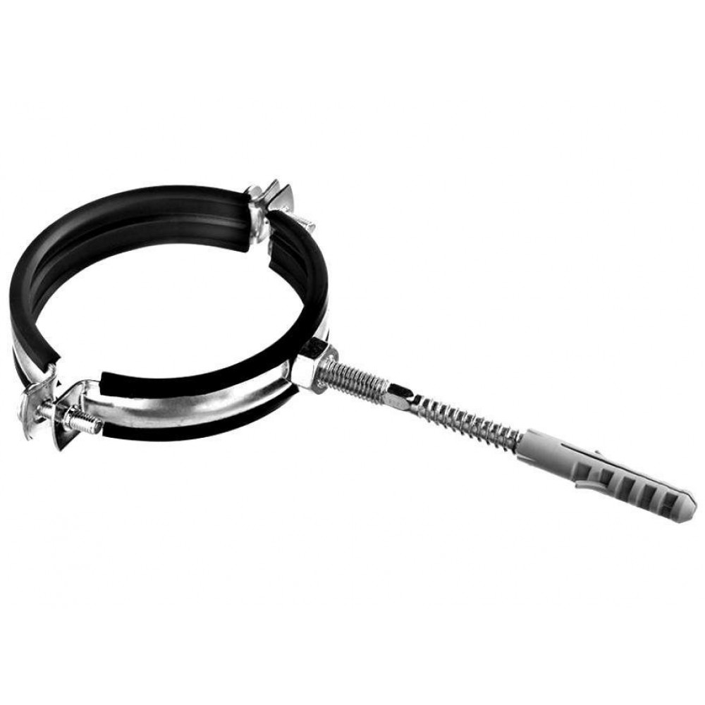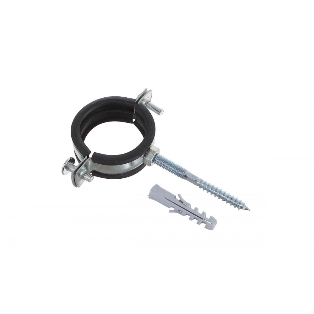 Сантехнический хомут с резиновым уплотнителем используется для крепления труб к вертикальным и горизонтальным поверхностям: к стенам, потолку, полу. Хомут имеет приваренную гайку размером М8 или М10 в зависимости от диаметра хомута. А также хомут поставляется в комплекте с дюбелем и шурупом.