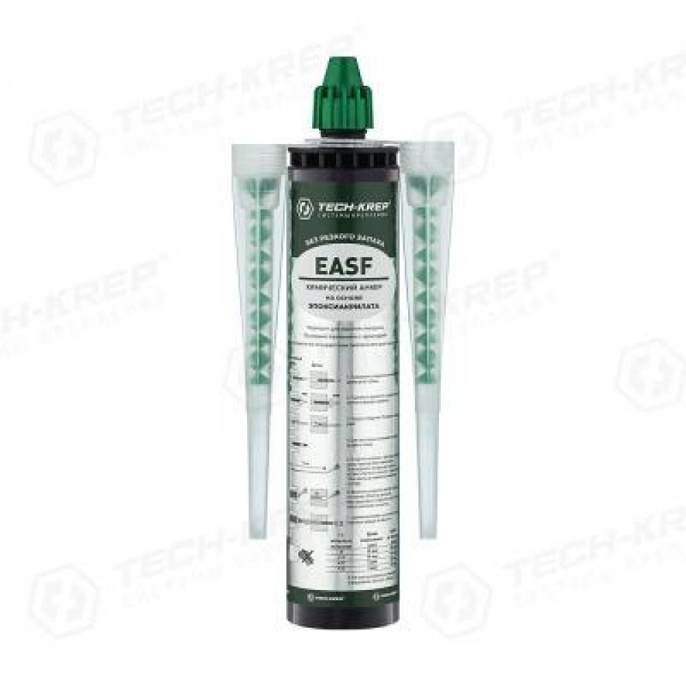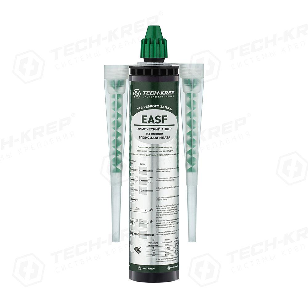 Химический крепеж образует монолитное соединение с материалом основания. Преимущества: Высокие нагрузки; Устанавливается в любые базовые материалы; Отсутствие распора позволяет устанавливать их в условиях минимальных краевых и осевых расстояний; Отсутствие жестких требований к размерам отверстий и простота установки существенно облегчают процесс монтажных работ. Область применения: применяется для крепления арматуры, строительных конструкций (балконы, колонны), лестниц, эскалаторов, кронштейнов, дверных и оконных коробок, складского оборудования (подъемники, стеллажи), защитных барьеров, систем трубопроводов, систем вентиляции, рекламных конструкций (баннеры, вывески, информационные щитки). Также может быть использован для заполнения трещин, которые образуются в результате сверления и в качестве ремонтного и связующего состава для ж/б конструкций. Материал: эпокси-акрилатная смола. Особенности: подходит для высоких нагрузок. EASF – это двухкомпонентный химический состав на основе синтетической эпокси-акри