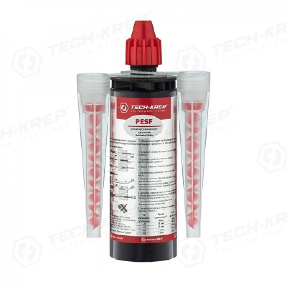 Химический крепеж образует монолитное соединение с материалом основания. Преимущества: Без стирола; Устанавливается в любые базовые материалы; Отсутствие распора позволяет устанавливать их в условиях минимальных краевых и осевых расстояний; Отсутствие жестких требований к размерам отверстий и простота установки существенно облегчают процесс монтажных работ. Область применения: применяется для установки лестниц, ограждений, элементов сантехнического оборудования, карнизов, различных конструкций средней тяжести, дорожных знаков, систем трубопроводов, систем вентиляции; для крепления анкерных стержней, шурупов, крюков различных типов. Идеально подходит для установки в пустотелые материалы с применением сетчатой гильзы. Материал: полиэстерная смола. Особенности: подходит для средних нагрузок. PESF – это двухкомпонентный химический состав на основе синтетической быстротвердеющей полиэстерной смолы, не содержит стирол и не имеет запаха. Не создает предварительного напряжения в бетоне. Используется совместно с м
