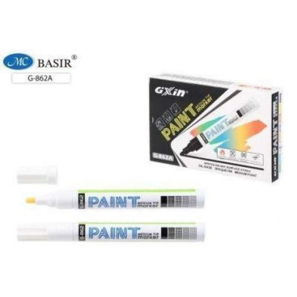 Маркер-краска на масляной основе белый Р-262. Водостойкая краска на нитрооснове не поддается атмосферным воздействиям и широко применяется в производстве для маркировки изделий из пластика, дерева, металла, камня, стекла, резины. Подвижный наконечник-дозатор регулирует поступление краски. Толщина 3-4 мм. Длинна линии письма 400 метров.