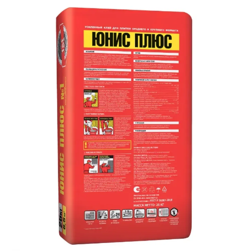 Клей для плитки Unis Плюс - усиленный клеевой состав для укладки любых видов керамической плитки, клинкерной плитки, плит из природного и искусственного камня, керамогранита среднего и крупного формата (до 90х90 см) на стены и полы в любых помещениях: влажных, сухих, промерзающих и отапливаемых. Клей также подходит для наружных работ, облицовки фасадов и цоколей зданий.