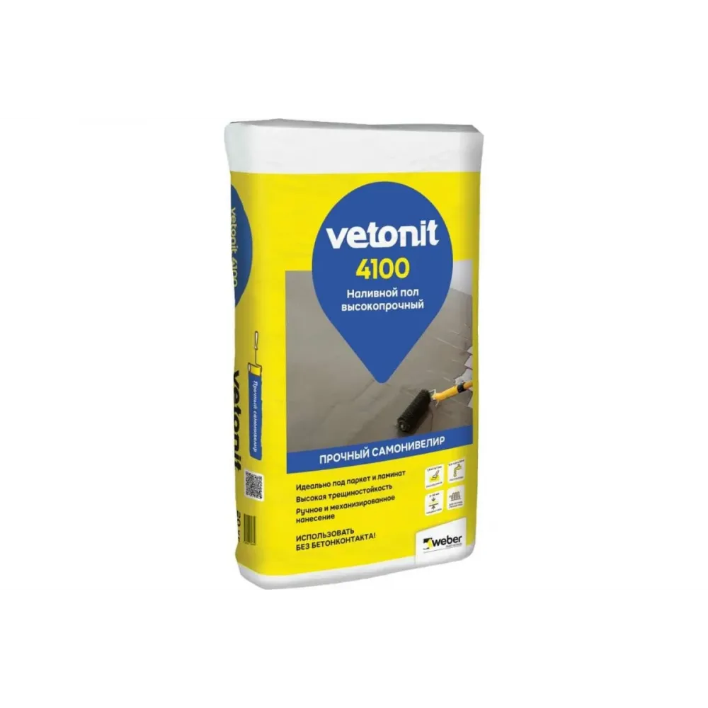 Наливной пол самовыравнивающийся высокопрочный, Weber.vetonit 4100 создает прочную поверхность под дальнейшую укладку напольных покрытий. Благодаря своим характеристиками подходит под любое напольное покрытие. Weber Vetonit 4100 разрешается использовать в жилых и офисных помещениях. Для сухих и влажных помещений. Ручное и механизированное нанесение.