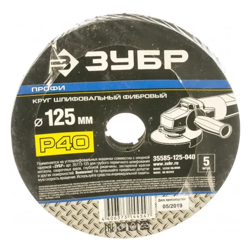 Технические характеристики Круг шлифовальный ПРОФИ фибровый (5 шт; 125х22 мм; P40) для УШМ ЗУБР